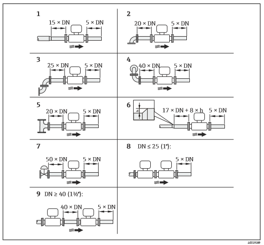 h 管道擴(kuò)徑時(shí)產(chǎn)生的高度差 1 一級(jí)縮徑管 2 單向彎頭(90°彎頭) 3 雙向彎頭(2 × 90°彎頭,相對(duì)) 4 3D雙向彎頭(2 × 90°彎頭,相對(duì),不在同一平面上) 5 三通 6 擴(kuò)徑管 7 控制閥 8 兩臺(tái)測(cè)量設(shè)備并排安裝,DN ≤ 25 (1"):直接法蘭對(duì)法蘭安裝 9 兩臺(tái)測(cè)量設(shè)備并排安裝,DN ≥ 40 (1½"):安裝間隙參考圖示說(shuō)明