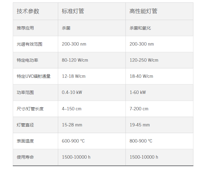 5、德國HERAEUS紫外線燈管技術參數(shù)對比