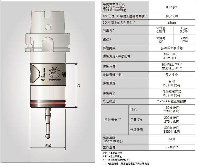 MARPOSS測頭VOP系列有多通道系統(tǒng),每個(gè)應(yīng)用可支持最多4個(gè)測頭;多主軸應(yīng)用,可以在一個(gè)機(jī)床上同時(shí)用兩個(gè)測頭去實(shí) 施兩項(xiàng)應(yīng)用 ;極度的萬能,緊湊和模塊化的配置可以出色的完成任何種類的應(yīng)用;很大的操作范圍(超過6米,110度的傳輸角);電池壽命很長;安裝便捷,程序簡單。
