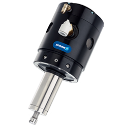 ①通過扭矩最大為65,000轉(zhuǎn)/分(取決于模塊尺寸)的氣動主軸進行裝置傳動。主軸可旋轉(zhuǎn)安裝,以保持整個機加工輪廓的公差。刀頭處的最大行程為±9 mm。移動(振動)主軸需要力(硬度)。其受第二個空氣接口控制。根據(jù)壓力不同,作用于銑削表面的力為3.1 N至89 N。