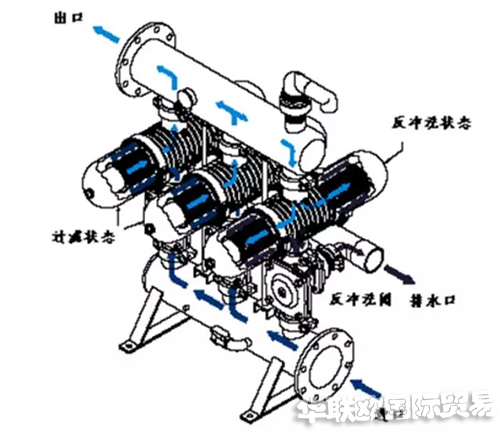 由其它過濾單元過濾后的清水從1號(hào)過濾單元的出水口進(jìn)入1號(hào)過濾單元,進(jìn)行沖洗,清洗水由排水口排出。