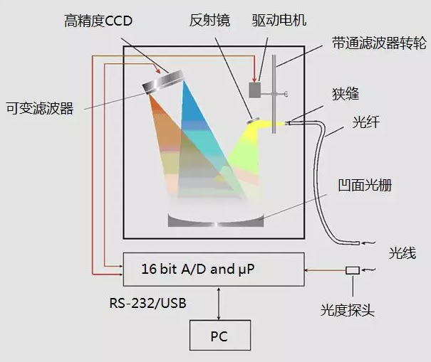 機(jī)械掃描式光譜儀通常由單色儀、光電倍增管探測(cè)器、數(shù)據(jù)處理系統(tǒng)等幾部分組成。其特點(diǎn)是測(cè)量精度高,但儀器龐大,結(jié)構(gòu)復(fù)雜,掃描時(shí)間較長。主要用于各種高精度光色測(cè)量領(lǐng)域,不適合測(cè)量對(duì)時(shí)間敏感的光源或其他快速測(cè)量應(yīng)用。