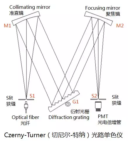 單色儀的光路如下圖所示,光源或照明系統(tǒng)發(fā)出的復(fù)合光線經(jīng)光纖引導(dǎo)至入射狹縫并投射到準(zhǔn)直反射鏡上,經(jīng)準(zhǔn)直反射鏡將發(fā)散光變換為平行光束再照射到衍射光柵,利用每個(gè)波長離開光柵的角度不同,由聚焦反射鏡再把某一波長的單色光反射到出射狹縫,光電倍增管(PMT)就可以測(cè)定這個(gè)波長的數(shù)值和強(qiáng)度。光柵在步進(jìn)電機(jī)的帶動(dòng)下勻速轉(zhuǎn)動(dòng),出射狹縫就可以得到不同波長的單色光,通過同步讀取光柵角度和光電倍增管的輸出信號(hào),就可以得到復(fù)合光的全部光譜信息。