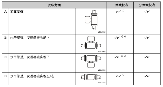 2) 電子部件過(guò)熱危險(xiǎn)! 流體溫度超過(guò)200 °C (392 °F)時(shí),標(biāo)稱口徑為DN 100 (4")和DN 150 (6")的夾持式 儀表(Prowirl D)禁止采用安裝方向B。